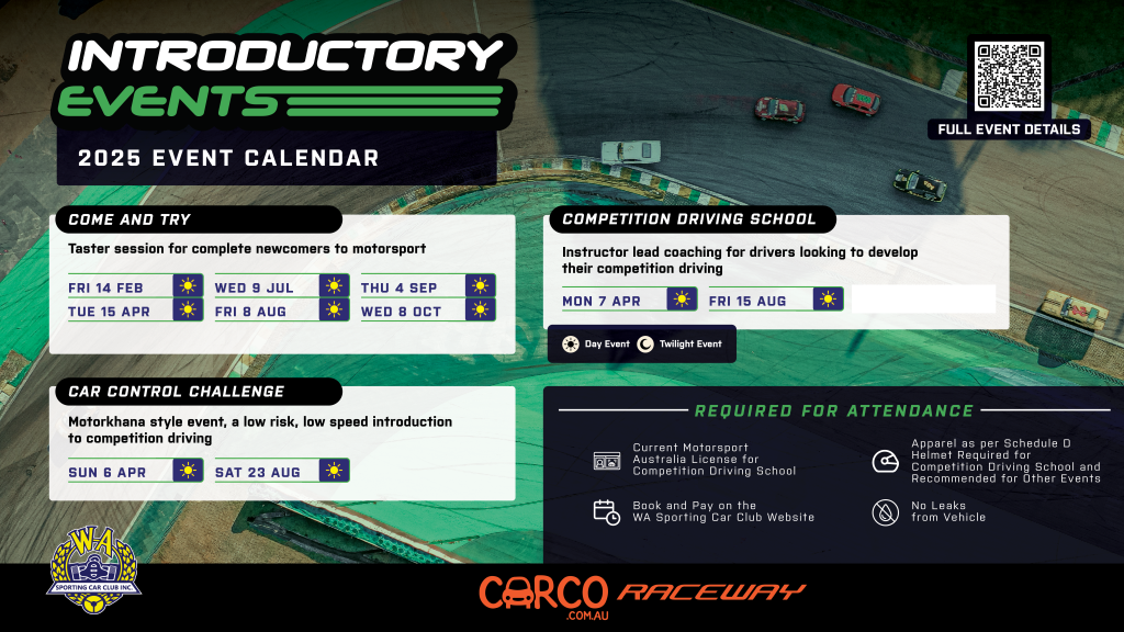 WA Sporting Car Club, in partnership with Electrical Group Training (EGT), brings you the Start Line range of educational and introductory days. These days are your entry point to enjoying motorsport and improving your driving skills on and off the track.
